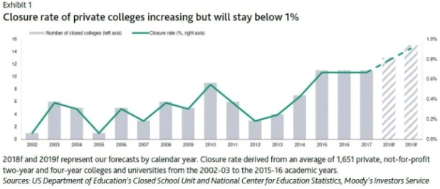 据穆迪投资者服务公司在今年7月23日发布的报告,美国私立大学的倒闭率已上升到每年约11所,而且预计这个比率还会增加。而据美国学习部预测,美国的私立大学的合并和倒闭案例,还将在未来几年里快速增长,现在已有25%的私立大学出现了财政赤字。其中,小型的私立大学首当其冲,这里面包括了许多奉行博雅学习的文理学院和艺术学院。这也使得许多学校削减文科院系的经费,裁减在文科院系教学的老师,甚至关闭某些文科项目。这也是人文学科在美国衰落的一个体现。