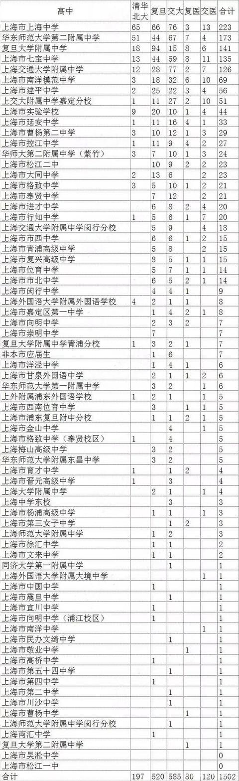 根据公开的数据,2019年复旦交大综评录取人数榜上,上海中学以165人高居第一,七宝中学为130人,交大附中为125人,复旦附中和华师大二附中分为为97人和91人,以上五校合计超过604人,占两校总录取人数的将近46%。