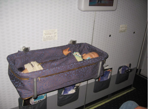 6个月以下的宝宝一定记得要提前向航空公司预定专用的婴儿摇篮;而能坐着的宝宝在飞机起飞和降落时一定要系上空姐提供的婴儿安全带。